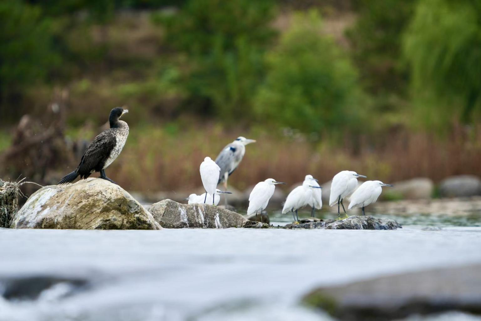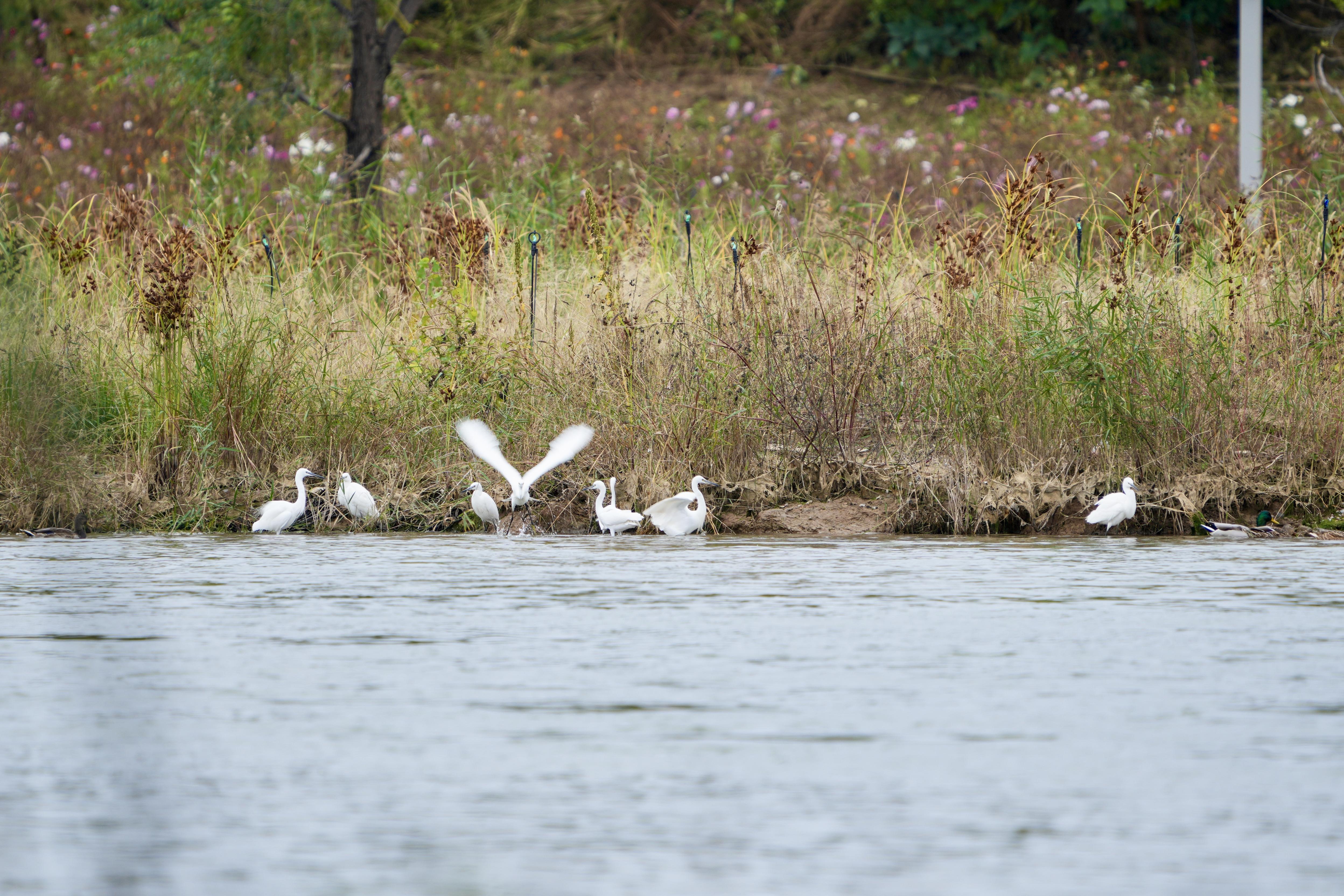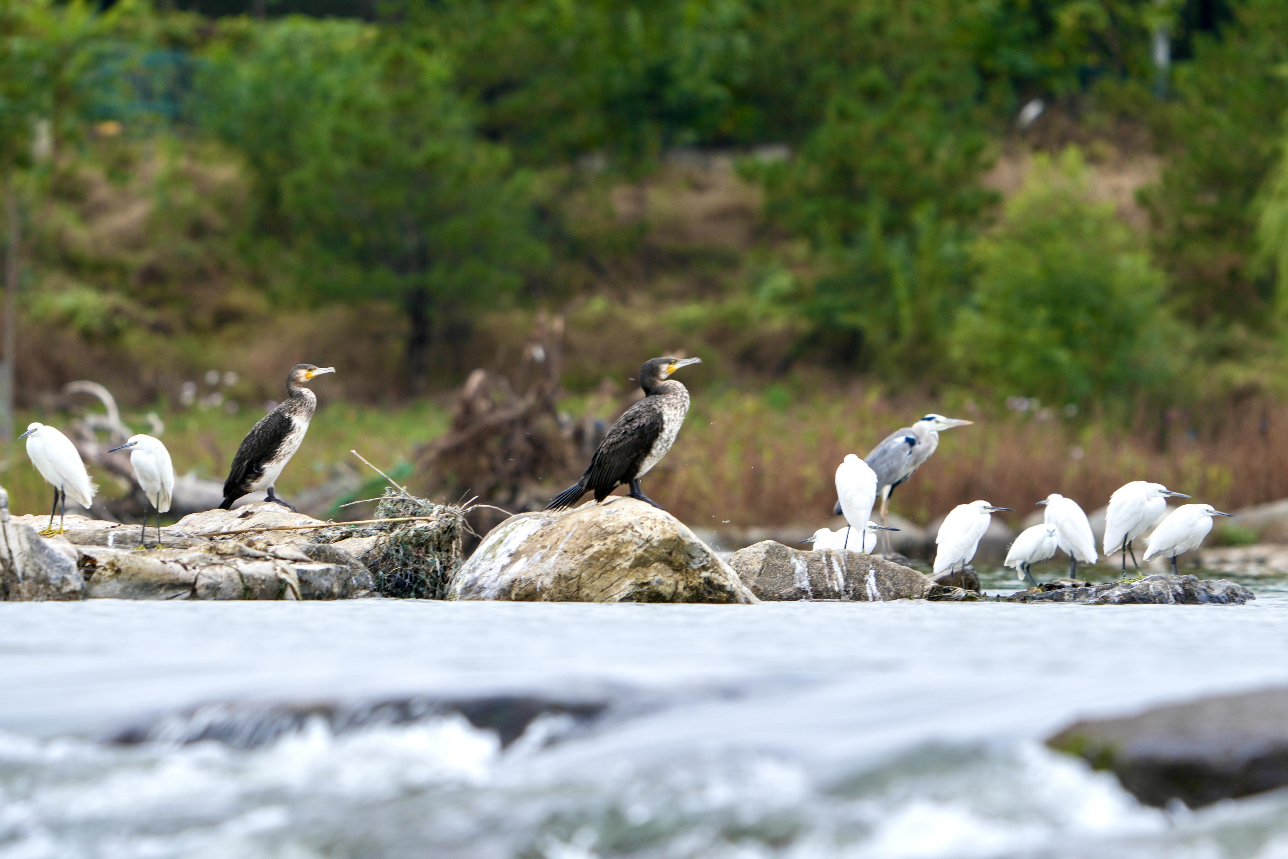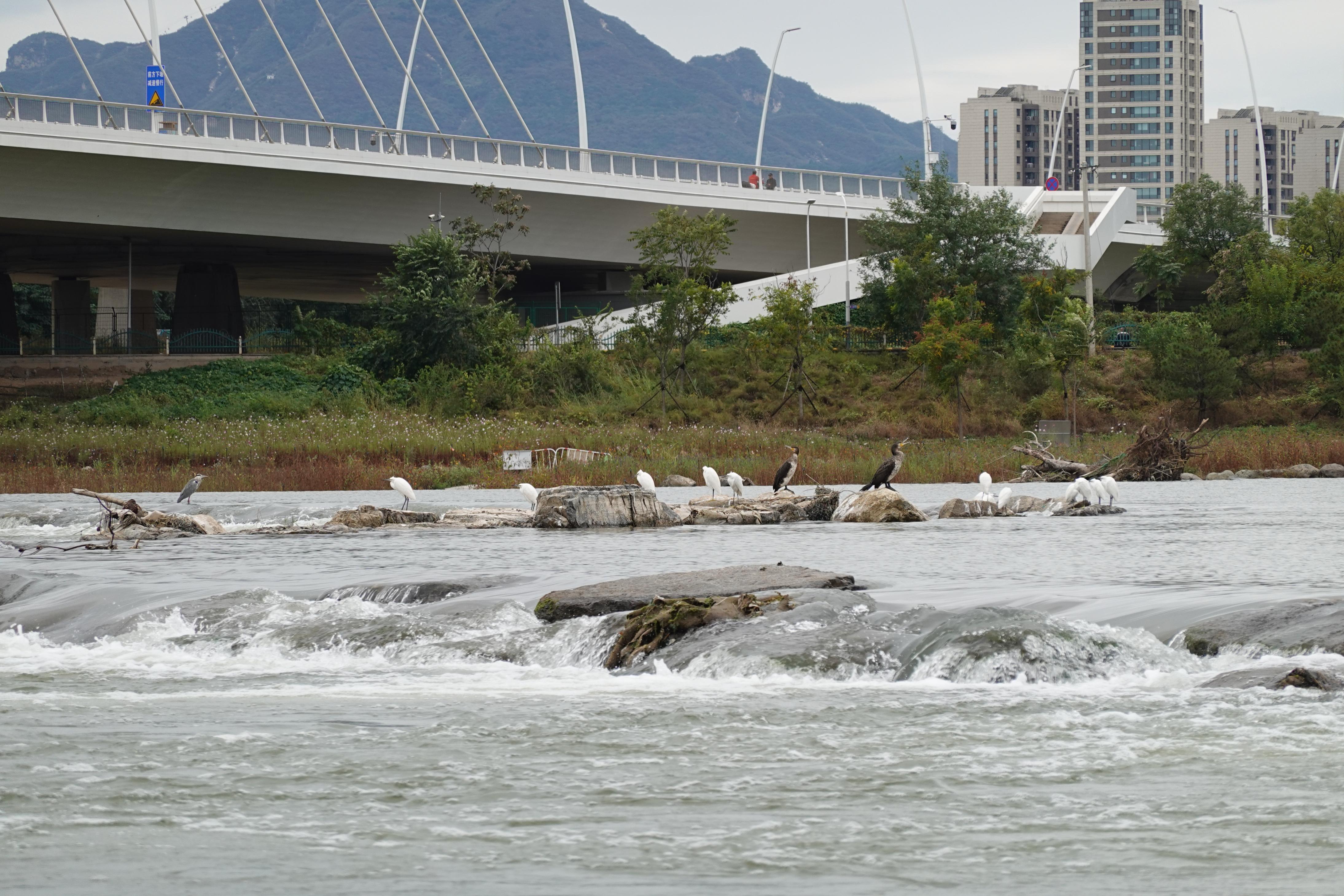 10月17日,市民在石景山的永定河畔惊奇发现,在湖水的中央,10余只白鹭、苍鹭、鸬鹚在水中嬉戏。据介绍,近年在永定河石景山段发现鸟中“大熊猫”震旦鸦雀稳定种群,文须雀,冠鱼狗,普通翠鸟等深受摄影爱好者喜爱的鸟种频繁现身。今年石景山区园林绿化局在监测中记录到国家二级重点保护野生动物斑头秋沙鸭,靴隼雕谷锦网,进一步证明了石景山区永定河周边生态环境的优质提升,通过鸟类生存的改善,展开了生态和谐的时代新篇章。
