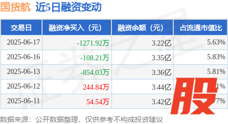 本站消息,6月17日,国货航(001391)融资买入1140.63万元天盈资本配资,融资偿还2412.55万元,融资净卖出1271.92万元,融资余额3.22亿元。
